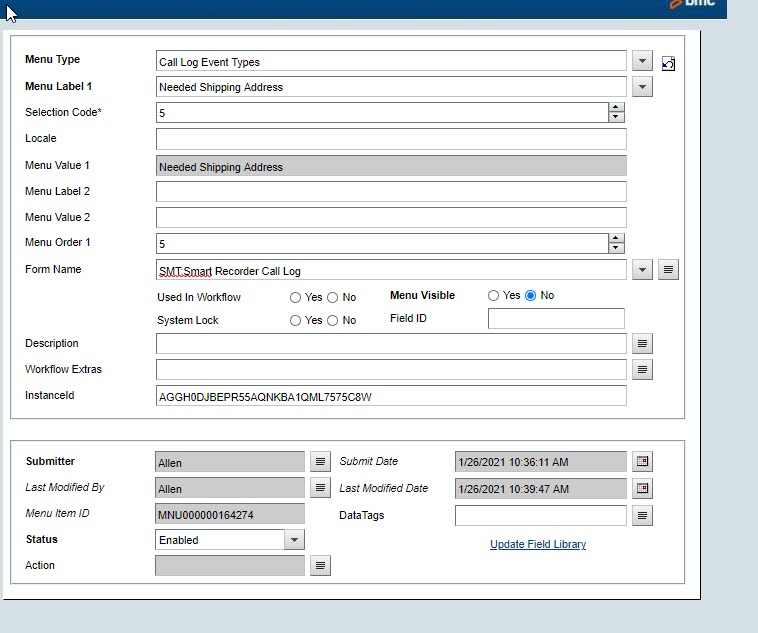 - In Mid-Tier, access the SYS:Menu Items form. Below, I’ve searched on Menu Type = Call Log Event Types and on Locale = $NULL$