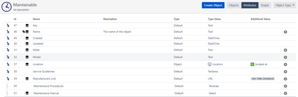 You can see by the hierarchy icon on the left of Location that this attribute was inherited from its parent. We added the Service Guidelines and Manufacturers Link attributes to the Serviceable object type.