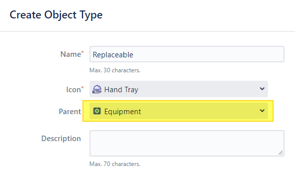 The reason for talking about inheritance will become clear was we look at how we create the Equipment types. In in the picture below, you can see that for Replaceable, we have specified that it has a Parent, which is the Equipment type:
