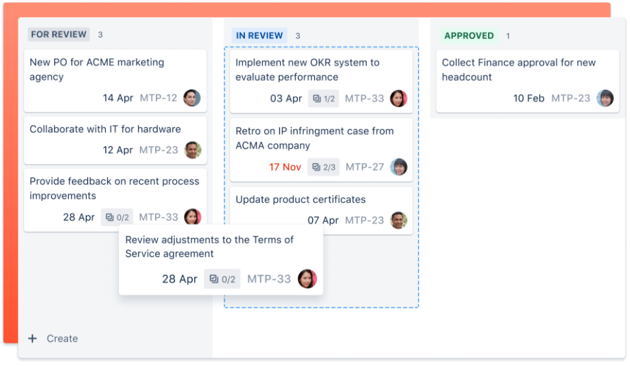 With Jira Work Management’s board view, you can ensure every document gets the same thorough review before approval. Keep your company just as clear as your revisions.
